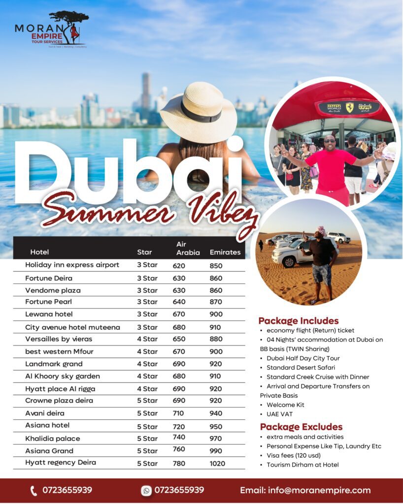 The transfer to the airport in Nairobi will be on your own arrangement. The flight to Dubai is an approximate of 5hours 23minutes. From the moment you land in Dubai, the next phase of your journey is completely hassle-free. You will meet the Moran empire tour services Representative at the airport and he will be ready to assist you with transport to your hotel. This service is available exclusively for all Bonfire Clients travelling to Dubai. Check into your resort and enjoy the first overnight stay in Dubai