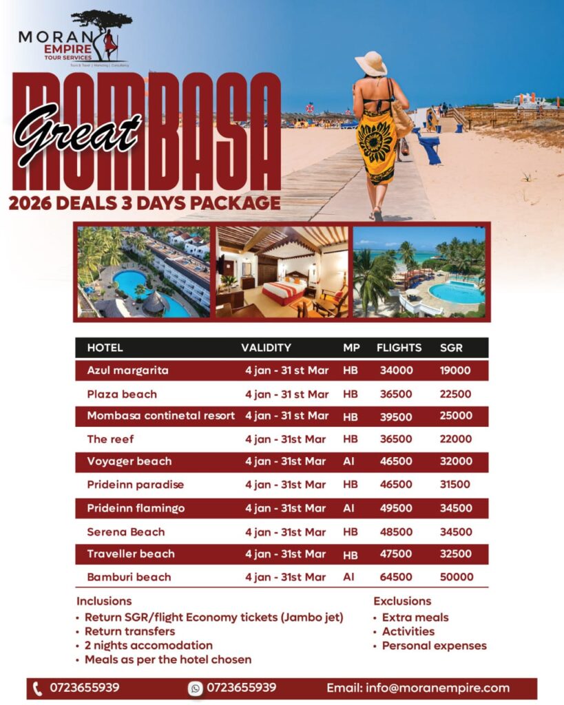 | Hotel Name | Validity | Meal Plan | Flight (KES) | SGR (KES) |